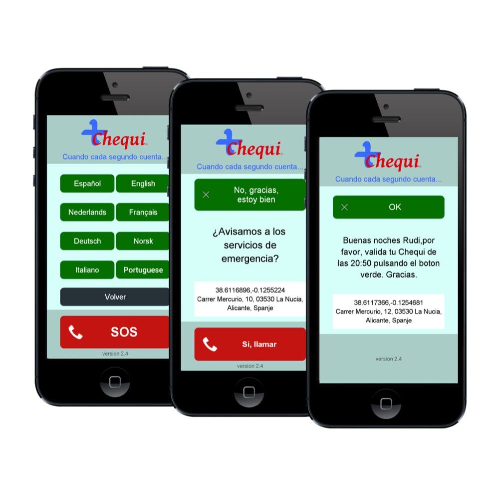 Chequi-App. Diseñado para cuidar de ti. Posibilidad de generar SOS en tiempo real, seas donde seas. Incluido Chequis (Controles de bienestar) ¡Un MUST para toda la gente mayor!